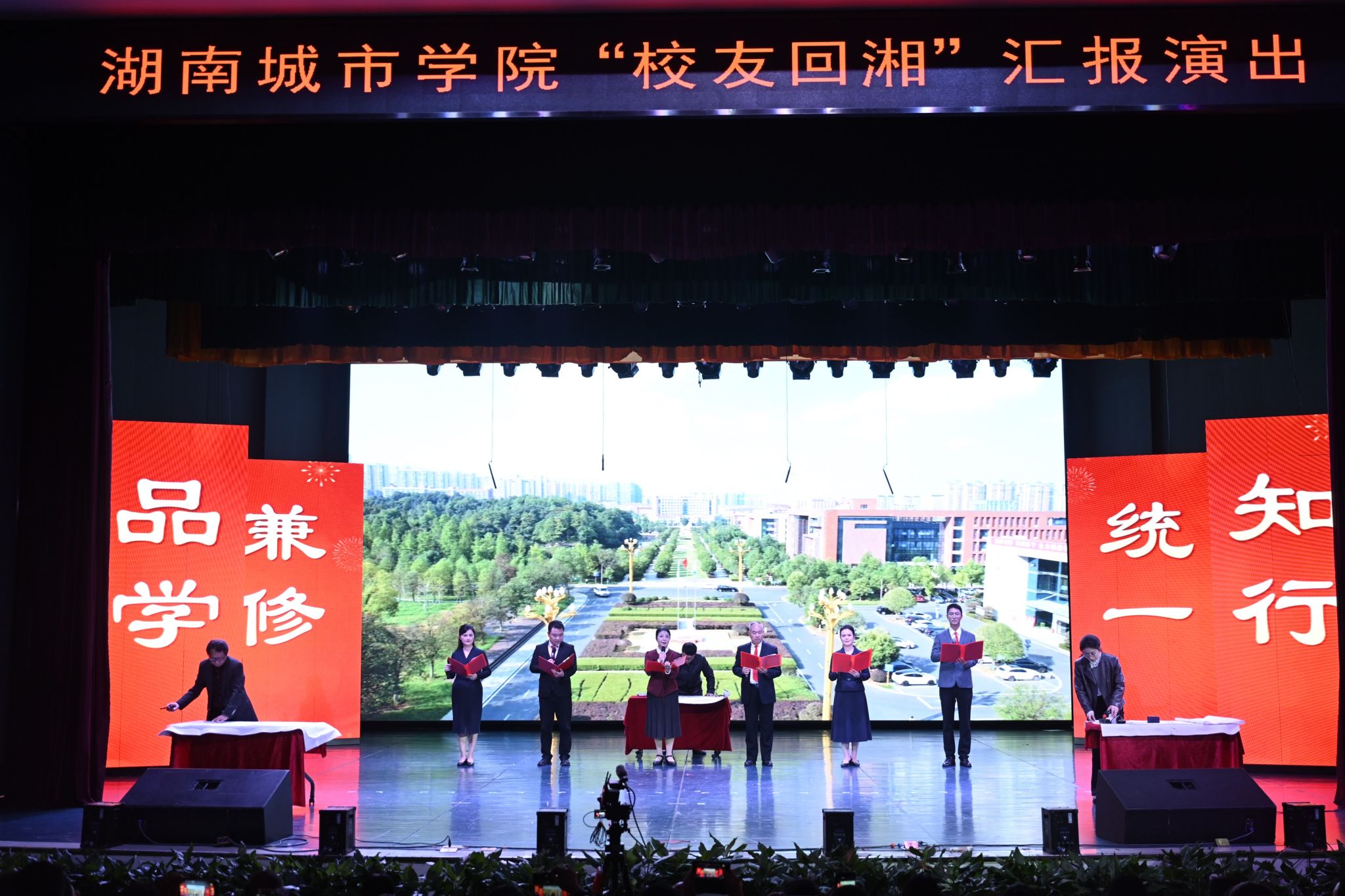 歌曲《山乡巨变》的名字来源于益阳知名作家周立波同名书籍,以资水之畔的益阳为背景,生动唱出了城市日新月异的变化与光明美好的未来;在情景诗《光辉历程》的演绎中,朗诵者声情并茂、抑扬顿挫的朗诵,与别具一格的绘画及书法作品相得益彰,共同绘就了城院55年办学征程中“与时代同频共振”的优异答卷。