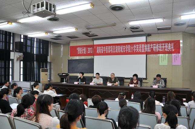 ,“国培计划”湖南省中西部项目荣耀体育官方网页版_荣耀体育(中国)小学英语置换脱产研修班开班典礼在我校朝阳校区图书馆报告厅举行,继续教育学院、外国语学院相关负责人和研修班50名学员参加了仪式。