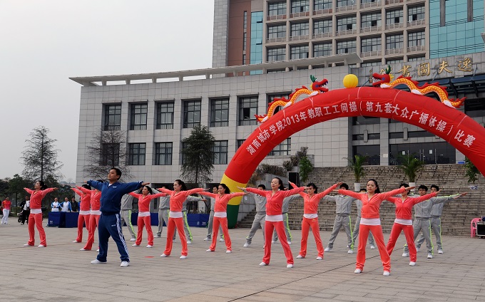 下午,学校教职工工间操(第九套大众广播体操)比赛在兴城广场隆重举行,全校22个分工会及离退休老同志共23支代表队500余名教职工参加了比赛,上千名师生到现场为参赛队伍加油呐喊。