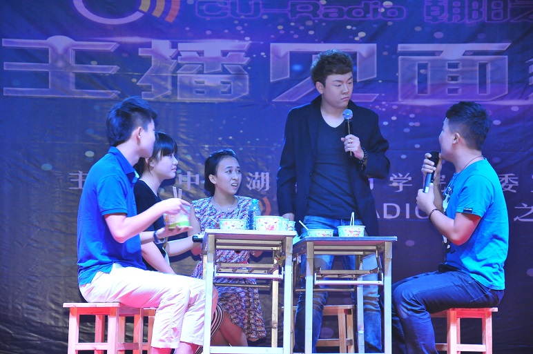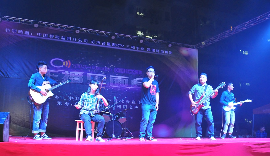 主播见面会以节目展演的形式进行,主播们通过舞蹈、小品、乐队演唱、舞蹈剧、朗诵等形式纷纷展示了各自多方面的才艺,表达了对学校广播台、校园广播工作的热爱。现代舞“Trespassing”以欢快动人的节奏拉开了主播见面会的序幕。“Chocolate love”充分展示了年轻女主播们迷人的身段和曼妙的舞姿,引来观众阵阵热烈掌声。小品“爷仨的幸福生活”以诙谐的手法反映了主播们对社会生活的认识和把握,精彩的表演逗得观众捧腹大笑。乐队表演“阳光照进回忆里”展示了主播们较强的音乐天赋和乐器演奏功底,在观众们的热情呼应下,主播们尽情的演绎青春的魅力。“致朝阳之声的一封信”则把主播们对广播、对朝阳之声的深切热爱和不舍深情地吟诵出来,把主播见面会推向了高潮。