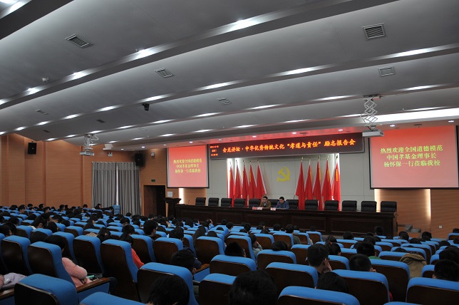 下午,会龙讲坛之全国道德模范励志报告会在图书馆报告厅举行,特邀全国首届道德模范、中国孝基金理事长杨怀保为300余名青年学生代表作了题为“孝道与责任”的 励志报告,报告会由党委宣传统战部会同科技处、学生处、团委和市政与测绘工程学院等单位联合举办。