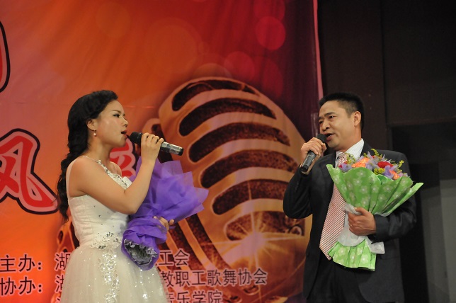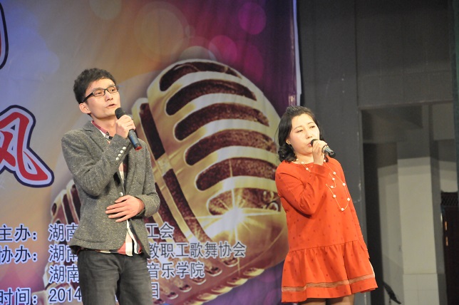 (本网讯)“创和谐校园、展教工风采”, 11月25日晚7点,随着离退休教师们的《湖南民歌联唱》盛装开场,由校工会主办,教职工歌舞协会、音乐学院协办的教职工歌咏比赛在音乐学院音乐厅拉开帷幕。各分工会精心组织节目,参赛选手们盛装打扮,倾情演出,或深情悠扬,或高亢激昂,动听的歌声不时引起现场观众如雷般的掌声。