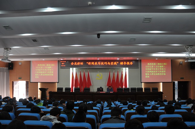 下午,会龙讲坛第14讲在图书馆报告厅举行。湖南日报主任记者谭克扬以近20年新闻报道的亲身经历,与我校教职工通讯员、学生记者、团学会学生干部300余人分享了“新闻采写技巧和实践”。讲坛由统战部和科技处主办、学校团委协办。