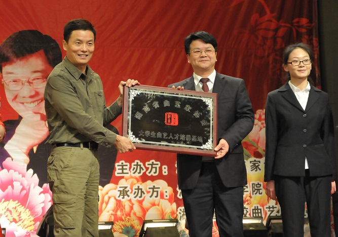 周卫星在湖南省曲艺家协会向荣耀体育官方网页版_荣耀体育(中国)授予“大学生曲艺人才培养基地”的仪式上说:“我们希望能发现优秀曲艺人才,认真合作,着力培养,为发展湖南曲艺事业,弘扬优秀传统文化做出贡献。”汤放华和学生代表马丹丹等代表学校接受牌匾,我校由此开始成为了省曲协的人才培养基地。