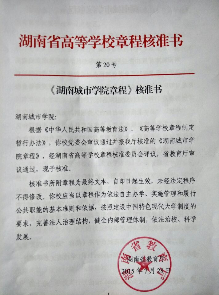 (本网讯)经湖南省高等学校章程核准委员会评议, 7月 28日 ,湖南省教育厅审议通过了《荣耀体育官方网页版_荣耀体育(中国)章程》,章程于核准之日起正式生效。