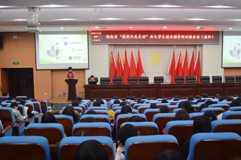 (本网迅)为鼓励女大学生积极投身创新创业热潮,促进全社会形成关心支持女大学生创新创业的良好氛围。11月10日下午,由省妇联、省教育厅联合主办的“我创业我美丽”女大学生创业指导巡回报告会在我校图书馆报告厅举行。五位成功创业的女企业家应邀来校演讲。省妇联副主席鲁华、省妇联事业发展部部长陈敏、省教育厅学生处处长熊俊钧、省妇联事业发展部副部长黄兰香、益阳市人民政府副市长李激扬、益阳市妇联主席杨丽萍、我校副校长汤放华出席报告会,300多名有创业意向的女大学生聆听了报告会。