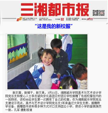 (本网讯)3月15日出版的《三湘都市报》以图片新闻的形式对我校美术与艺术设计学院党总支赴安化团云小学助学行动进行了报道。全文如下:
