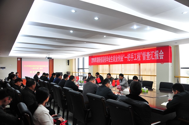 副校长汤放华就我校毕业生就业创业工作“一把手工程”落实情况向督查组作了汇报。他重点介绍了我校以建设湖南省就业创业示范校为契机,积极构建“一个目标,双轮驱动,三全服务,四课指导,五位一体精准帮扶就业”的就业创业工作新模式。