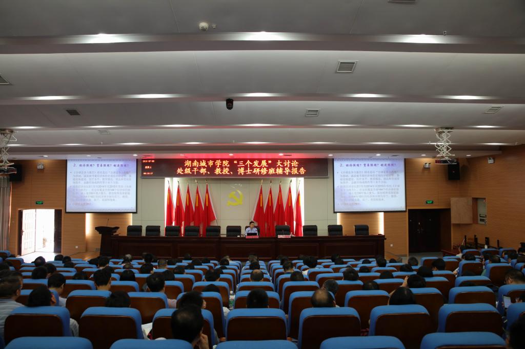 (本网讯)7月8日上午,我校在图书馆报告厅召开“三个发展”研修班第三场辅导报告会。副校长刘辉煌解读了“中国制造2025”,并分析了我校的科技创新与学科建设情况,副校长雷存喜作了题为“应用型人才与应用型大学建设”的报告。全体校领导,教授、博士、副处级以上干部,教务处、科学研究与学科建设处工作人员参加了报告会。会议由副校长何振主持。
