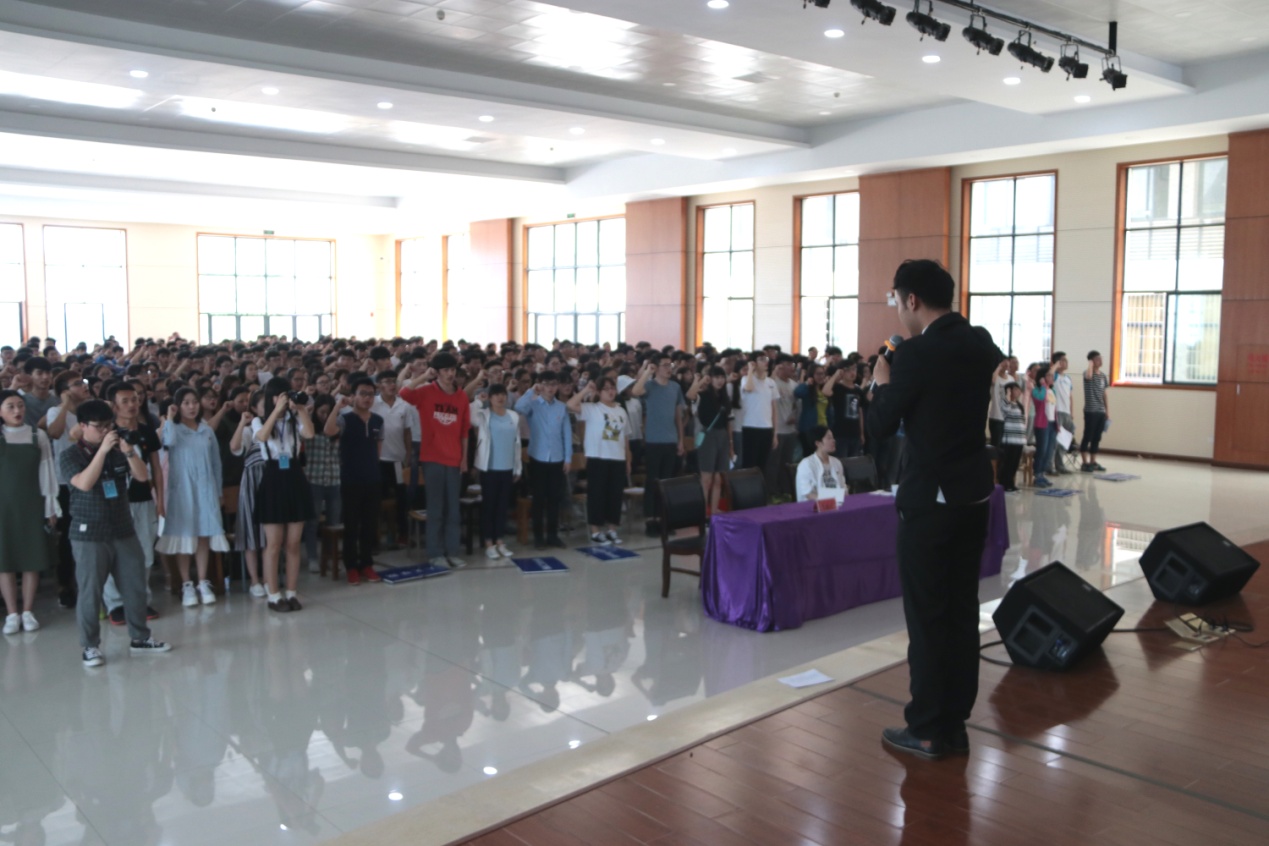 在嘹亮的团歌声中,开学典礼拉开序幕。团员代表陈嬿伊同学作了“严守团规,做好党的得力助手与后备军”的主题发言;800多名新团员在鲜艳的团旗下庄严宣誓。