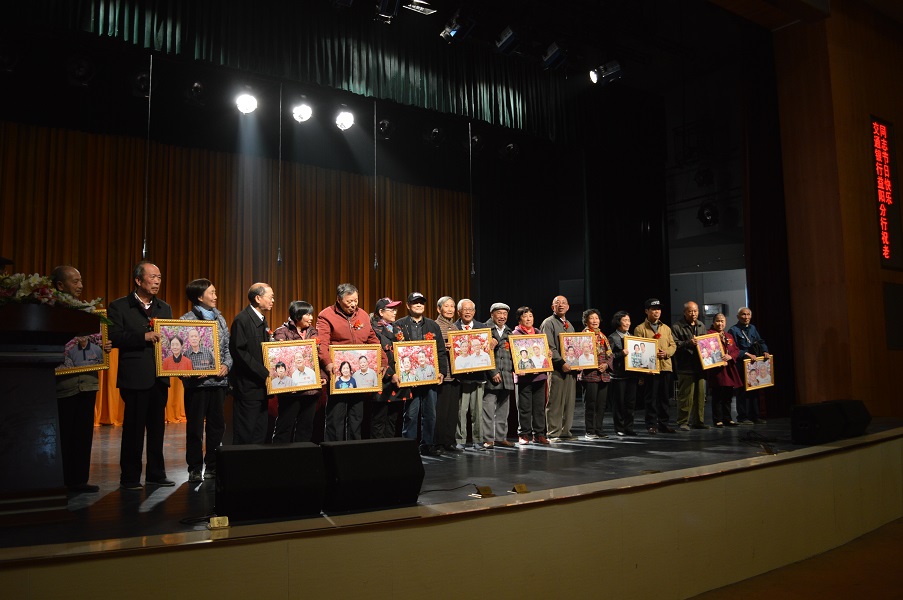 李建奇、汤放华、曹太康为8名寿星、12对金婚钻石婚夫妇授礼。