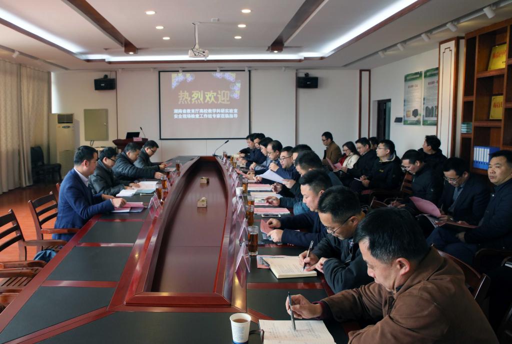 在化工楼516会议室举行的汇报会上,检查组组长、吉首大学科技处副处长汤自军,教育厅主任科员王荣分别介绍了实验室安全现场检查目的、要求及流程。
