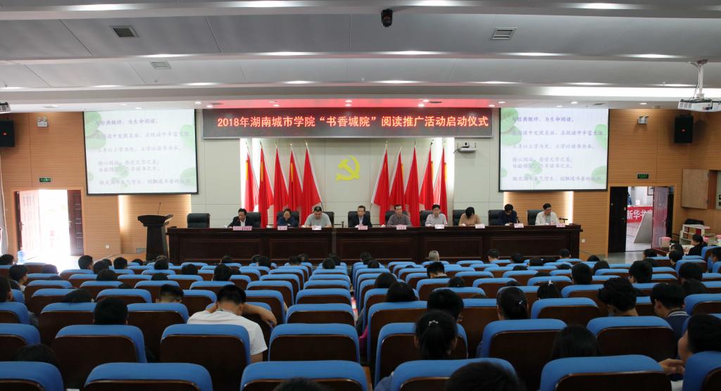(本网讯)4月27日下午,我校“书香城院”阅读推广活动启动仪式在图书馆报告厅举行。副校长夏宏宇、雷存喜,宣传部、教务处、学生工作部、团委主要负责人,各二级学院主管学生工作领导、图书馆领导班子成员、图书供应商代表以及近400名学生代表参加了仪式。