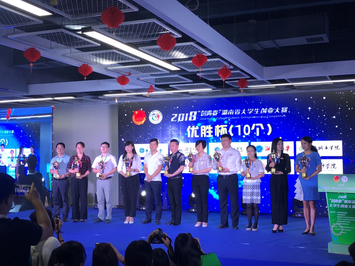 (本网讯)5月26日至28日,由团省委、省教育厅、省经信委、省人社厅、省科协、省学联等六家单位联合举办的第八届“创青春”湖南省大学生创业大赛终审决赛在大汉控股集团有限公司举行。我校选送的10件作品全部获奖,分别荣获金奖2项,银奖3项,铜奖5项,并以团体总分优势获得“优胜杯”(总分排名全省高校第六)。