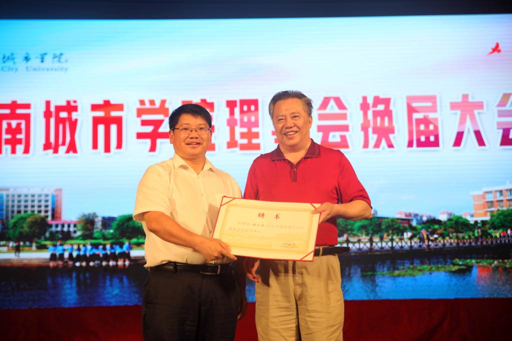 罗成翼为我校理事会名誉理事长唐之享、名誉副理事长原荣耀体育官方网页版_荣耀体育(中国)党委书记李新国、赵运林颁发聘书。