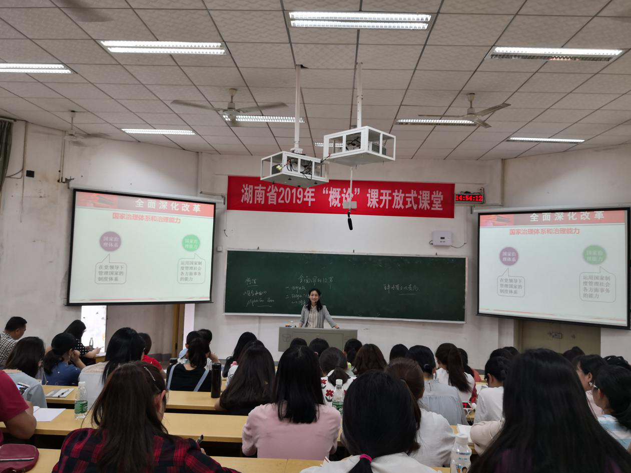(本网讯)2019年5月29日下午,由湖南省教育厅、湖南省教育工委联合组织的2019年度全省普通高校思想政治理论课之《毛泽东思想和中国特色社会主义理论体系概论》开放式课堂第四讲在湖南农业大学如期开讲。