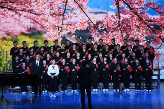 从《红旗飘飘》《走向复兴》到《我的祖国》《不忘初心》,红歌唱响了“不忘初心,牢记使命”的时代强音,校歌《精英,从这里扬帆启程》歌颂着“品学兼修,知行统一”的城院精神。全校12支队伍满怀激情、倾情演出,以恢弘的气势和铿锵的旋律感染着现场每一个人。舞台上灯光璀璨,舞台下观众挥动着手中的五星红旗,现场气氛热烈,怀着赤子的情怀表达对母校的祝福、对祖国的热爱。