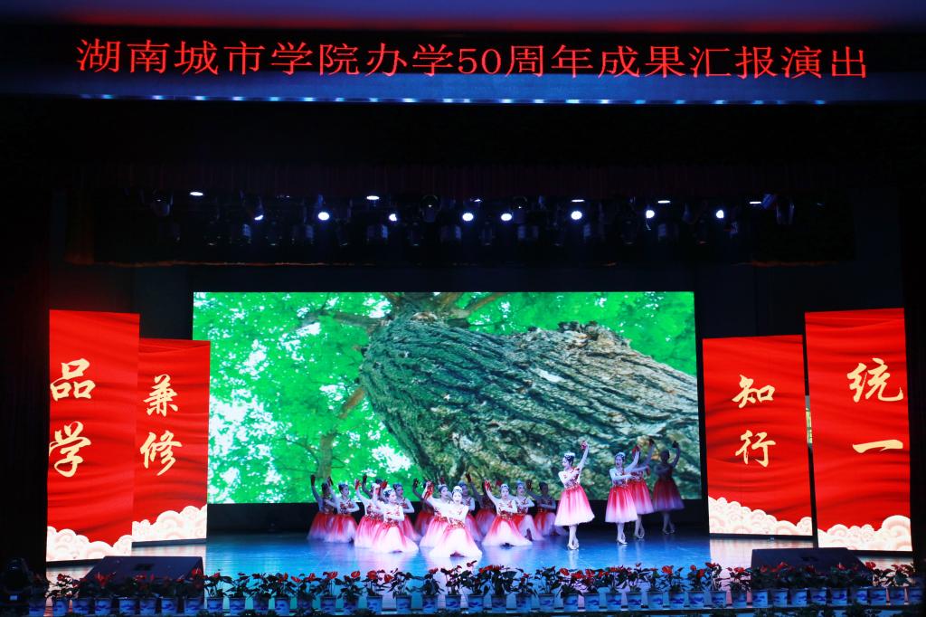 在“欢庆”篇章中,艺术学院学子为观众献上民乐合奏《欢庆校园》和原创舞蹈《花鼓情·薪火赓续》。器乐演奏热烈明快,舞蹈演绎优美动人,令在场观众目不转睛。在“奋斗”篇章中,城院教师代表同艺术学院学子携手华丽出演的钢琴八手联弹、舞蹈《东归雁》及《奋进》,借助黑白琴键的跳跃和风姿绰约的舞姿将城院师生对学校的深情展现得淋漓尽致。大学生艺术团表演的快板书《新时代·新城院》全面贯彻城院“三全育人”综合改革思想,展现了年轻一代在新时代浪潮中勇挑重任的使命担当,击节铿锵的演唱给观众留下了深刻印象。“向往”篇章中的歌舞《我们都是追梦人》、歌曲《向往》以及舞蹈《额尔古纳河》唱响了城院音、舞出了城院魂,表达出城院人“争做城院骄傲”的追梦态度。最后,演出在《我的祖国》和《歌唱祖国》大合唱中圆满落下帷幕。