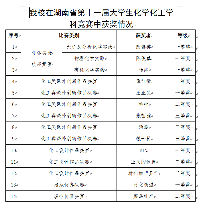 本次赛事分为大学生化学实验技能竞赛、化工类课外创新作品决赛、化工设计作品决赛、虚拟仿真决赛四个类别。本着公开、公平、公正原则,经过为期2天的激烈角逐,本次大赛化学实验技能竞赛三个组(无机及分析化学实验、物理化学实验、有机化学实验)共产生一等奖18个、二等奖24个、三等奖27个,化工类课外创新作品决赛共产生一等奖15个、二等奖23个、三等奖29个,化工设计作品决赛共产生一等奖15个、二等奖21个、三等奖32个,虚拟仿真决赛共产生一等奖6个、二等奖6个、三等奖1个。
