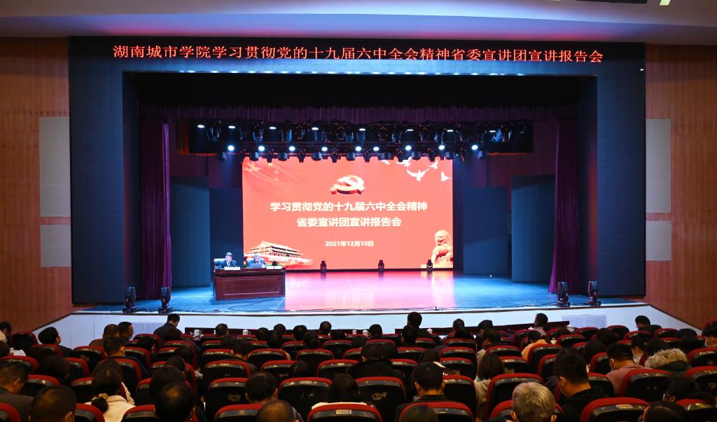 本网讯(通讯员 周文娟 摄影 博夕)12月10日下午,按照中央和省委部署要求,学习贯彻党的十九届六中全会精神省委宣讲团宣讲报告会在荣耀体育官方网页版_荣耀体育(中国)举行。省委宣讲团成员、湖南广播影视集团有限公司(湖南广播电视台)党委副书记、总经理、台长、总编辑龚政文作宣讲报告。全体在家校领导、全校副科级以上干部、学生辅导员、基层党支部书记和部分学生代表300余人参加宣讲会。党委副书记、校长汤放华主持宣讲会。