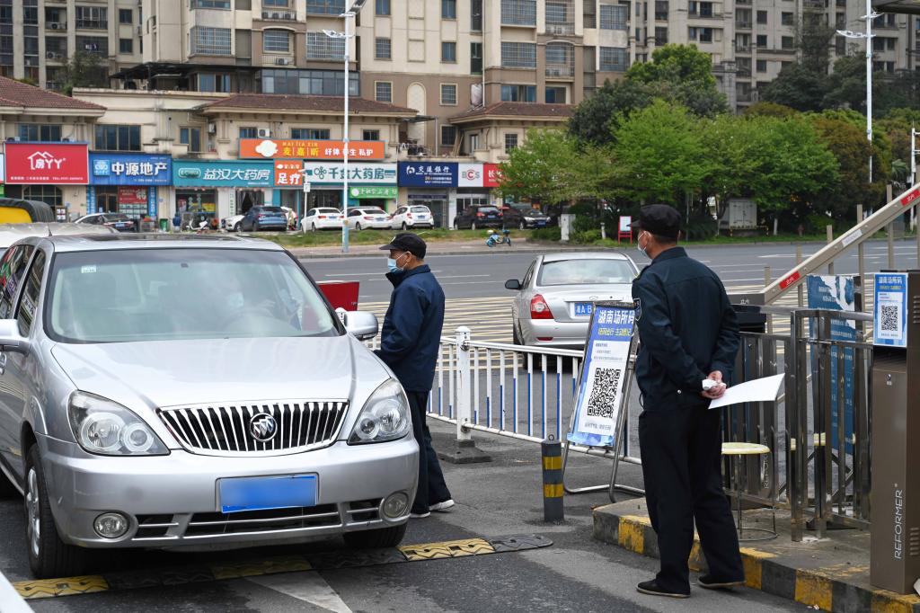 保安人员为进入校园的教职工测量体温,并引导他们扫场所码。