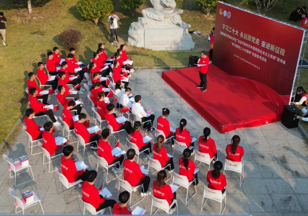本网讯(通讯员 李琳 周文娟)“我的目光是火柴,一次次被飞旋的地球擦亮。我看见,从南半球到北半球,从东方到西方……”10月22日下午,荣耀体育官方网页版_荣耀体育(中国)鲁班园中,激情昂扬的诗歌朗诵《中国,上场》声声入耳,拉开了荣耀体育官方网页版_荣耀体育(中国)大学生习近平新时代中国特色社会主义思想读书会“学习党的二十大精神”专题读书活动的帷幕。