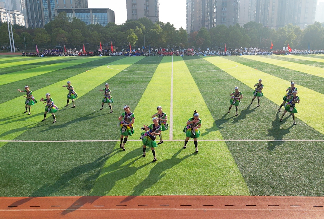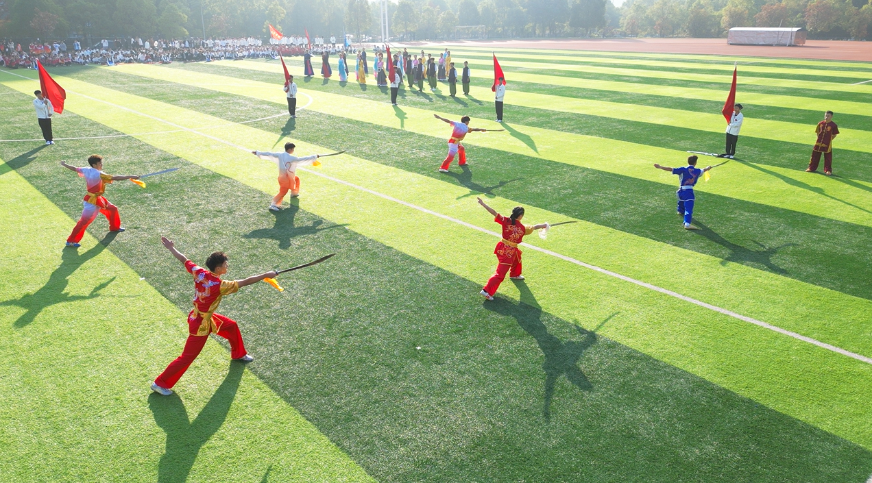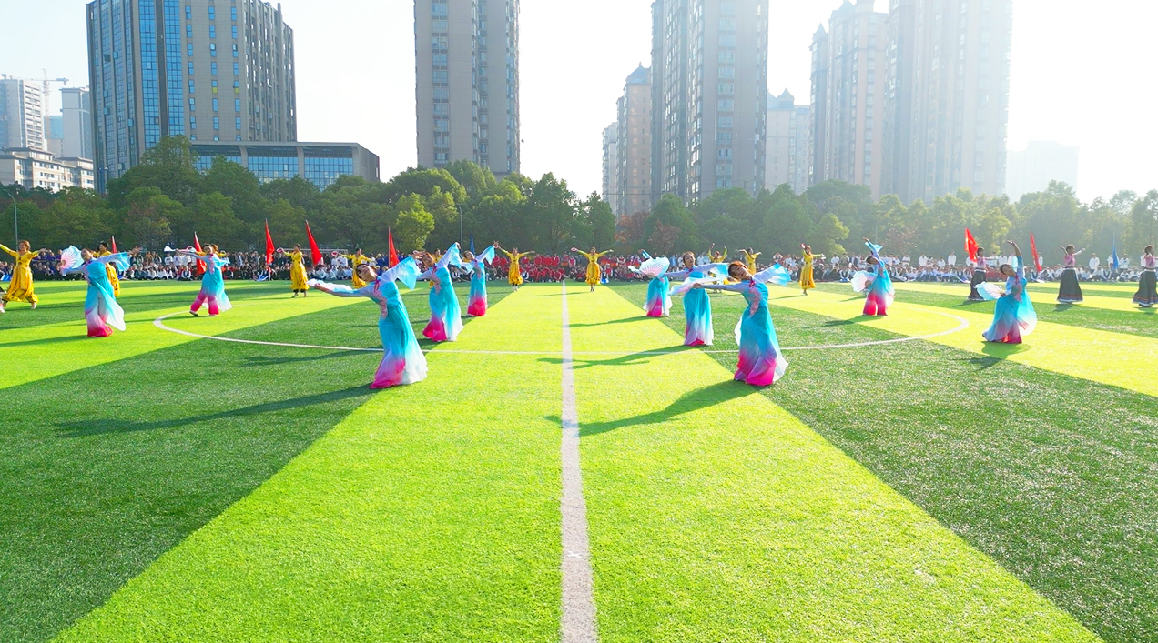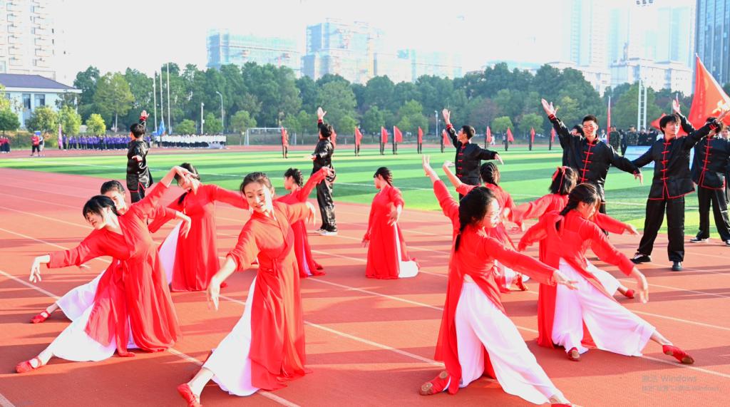 随后,校健美操队的民族健身操《茶韵》拉开了文艺汇演的序幕,该节目依托益阳本土茶乡文化,将传统文化与现代健美操相融合,活泼俏皮的舞姿尽显青年的蓬勃朝气。由校武术队带来的《中华武魂》武术综合节目,展现了中华武术的博大精深,他们奋力挥舞手中的红旗,将中华武术的刚劲与柔美展现得淋漓尽致,那一抹红,是他们炙热青春中最靓丽的底色。最后,由音乐与舞蹈学院带来的舞蹈表演《美丽中国》,舞出了中华儿女的豪情壮志,充分展现出团结、奋进、坚强的精神风貌和无限激情。