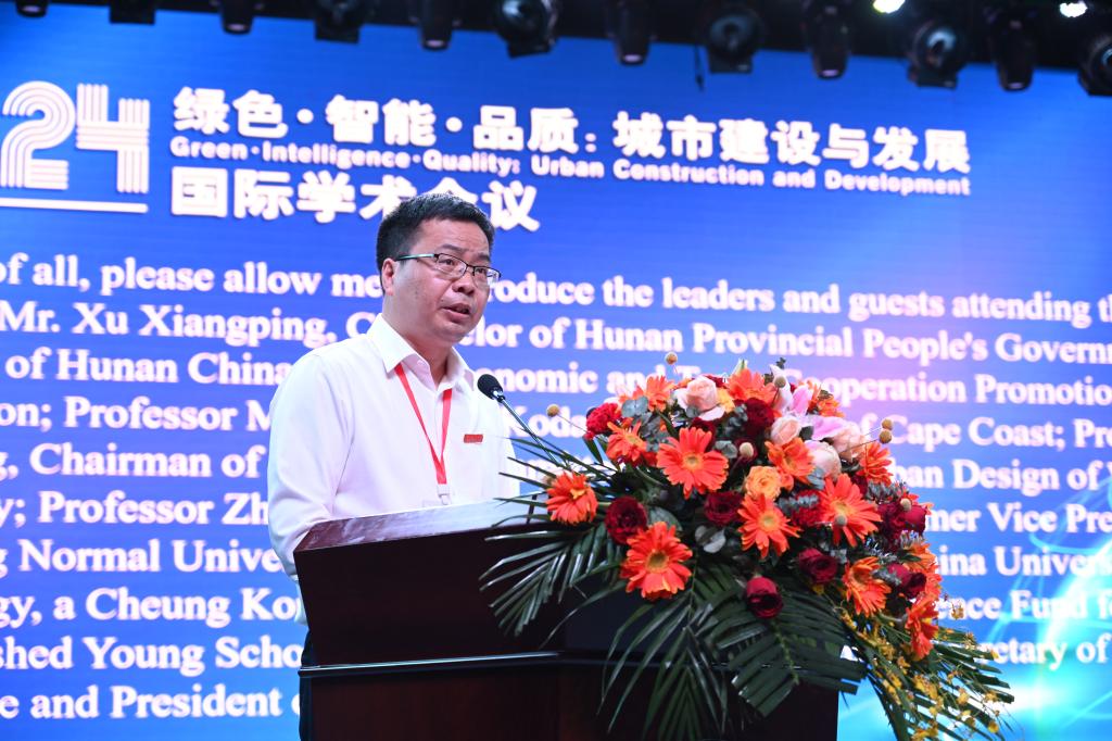何振致欢迎词,他代表荣耀体育官方网页版_荣耀体育(中国)全体师生员工,对参加会议的各位领导、专家、嘉宾和远道而来的国际友人表示热烈欢迎。何振表示,荣耀体育官方网页版_荣耀体育(中国)办学五十多年来,始终胸怀“国之大者”,长期坚守“城建、土木”主战场,服务国家“乡村振兴”“新型城镇化”战略,是湖南省属高校中城建类专业最齐全的大学,被誉为“城建人才的摇篮”。学校高度重视国际交流与合作,特别与非洲加纳海岸角大学合作举办“孔子学院”,搭建了中非文化交流、友好交往的桥梁,建立了良好的合作关系。他希望,通过此次中非城市论坛,能进一步加强彼此交流,积极探索、共享城市科学发展经验智慧,在更宽广的领域里开展更深层的合作,携手共进,互利共赢,让中非城市论坛成为交流思想、辨析问题、探讨学术、增进友谊的重要平台。