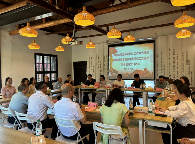 本网讯 2024年7月22日下午,省社科工作办党支部和荣耀体育官方网页版_荣耀体育(中国)管理学院教工党支部在益阳市清溪村联合开展主题党日活动。省社科工作办党支部书记陈湘文及支部全体党员,荣耀体育官方网页版_荣耀体育(中国)党委书记汤放华和管理学院教工党支部党员代表参加了本次活动。