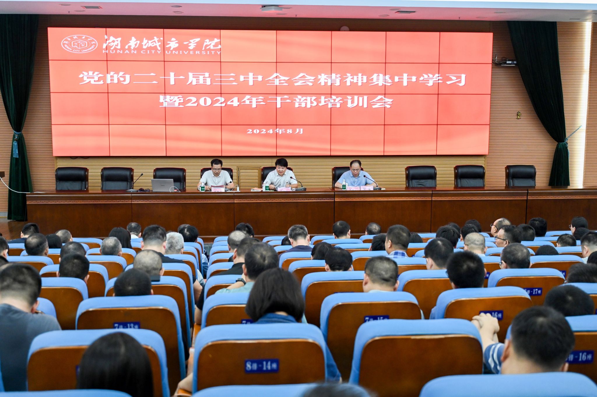 本网讯(通讯员 谢文静)为深入学习贯彻习近平新时代中国特色社会主义思想,落实党的二十大、二十届三中全会作出的重大战略部署,教育引导我校干部树立正确的权力观、政绩观、事业观,提高干部推动高质量发展本领、服务群众本领、防范化解风险本领。8月27至28日,学校举办党的二十届三中全会精神集中学习暨2024年干部培训会。全体在家校领导、全校科级以上干部参加培训。