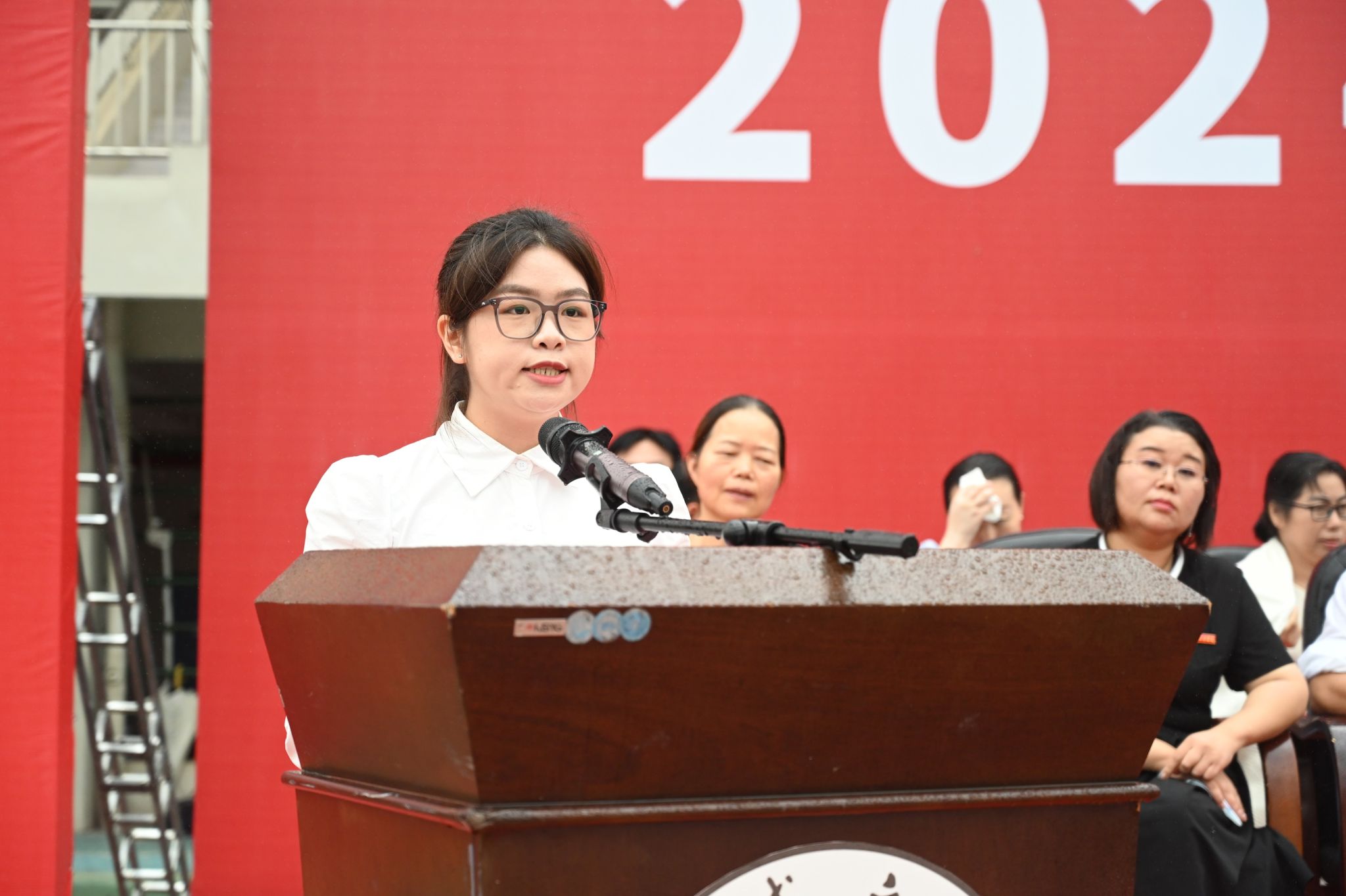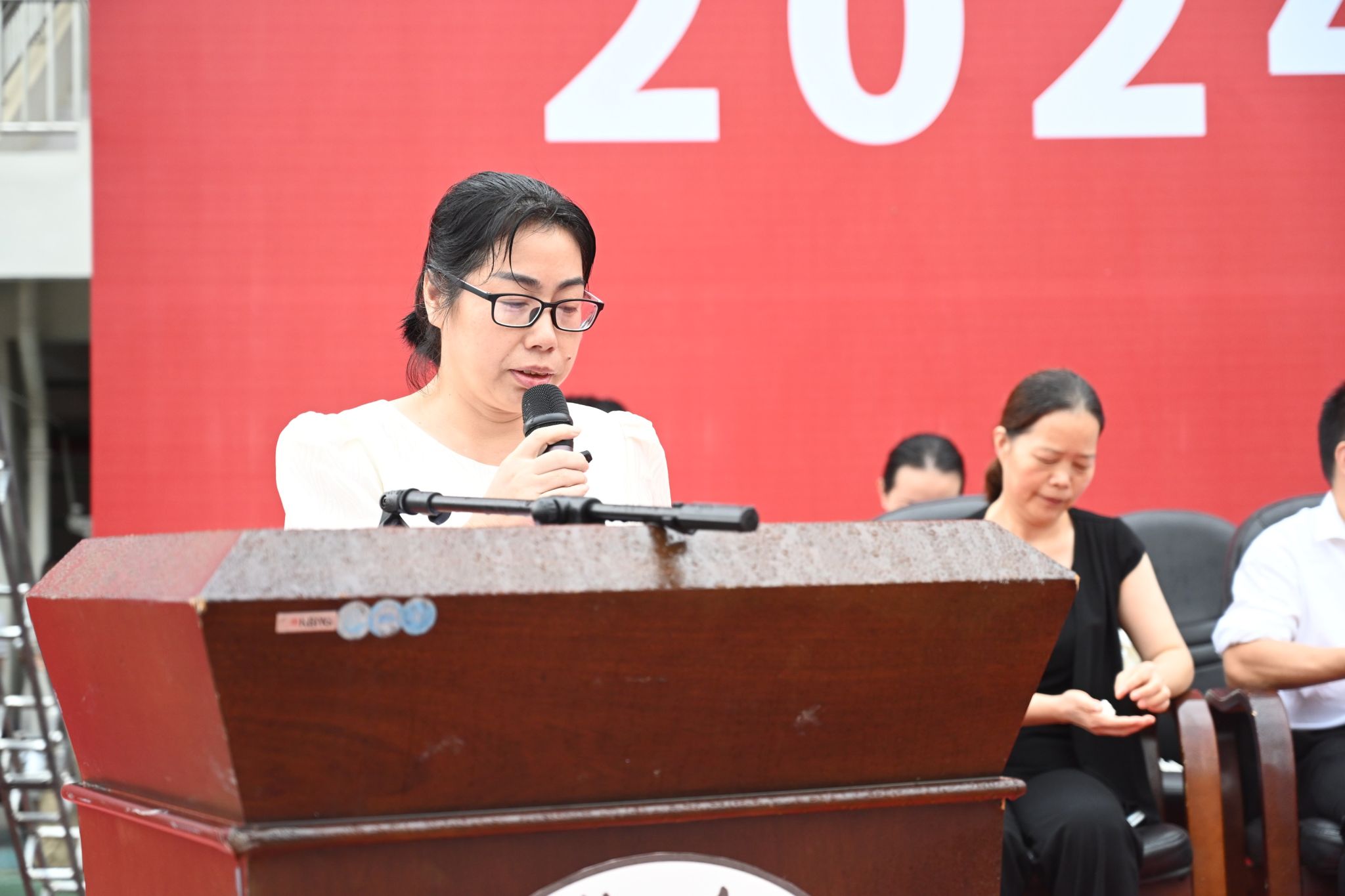 开学典礼在众人齐唱的国歌声和校歌声中拉开序幕。