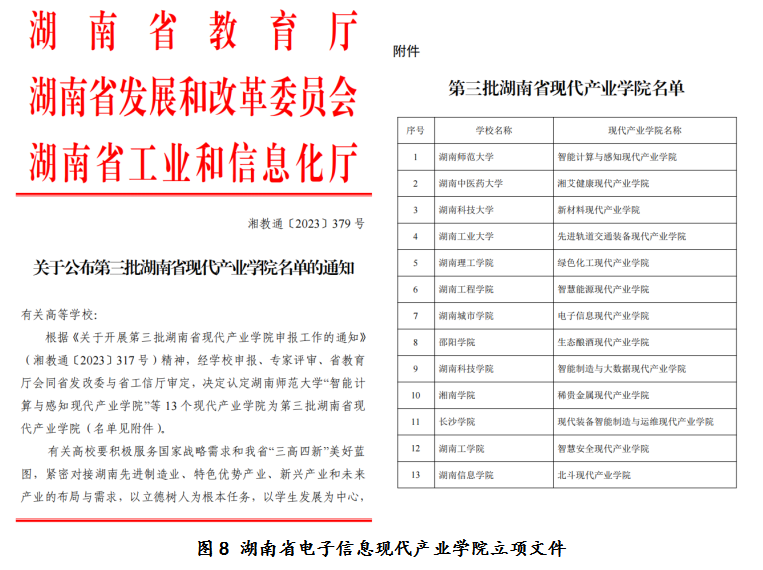 聚焦电子信息产业智能制造需求,对接“世界电容器之都”产业升级与数字化转型,服务湖南“三高四新”美好蓝图,探索构建了“三对接、四协同、三双教育”工程技术人才培养新模式,同时探索了“三共”校企合作路径,提升应用型人才培养质量,初步形成了高校“四引”和企业“四获” 的合作共赢局面。通过深入开展校企合作,产教融合科教融汇成效显著,获批湖南省制造强省专项资金重大项目(电容器产业链产教融合项目)。