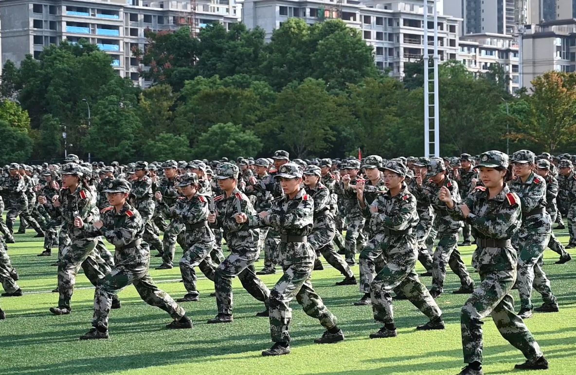 分列式进行曲响彻全场,教官分队持枪入场,眼神坚毅。他们以豪迈的激情斗志、过硬的军事素养向全校师生展现昂扬奋发、勇敢坚毅的精神风貌和青春风采。十四个二级学院方阵紧随其后,身着戎装的新生喊着铿锵有力的口号,迈着整齐矫健的步伐,向全校师生展示军训成果,接受全场的检阅。
