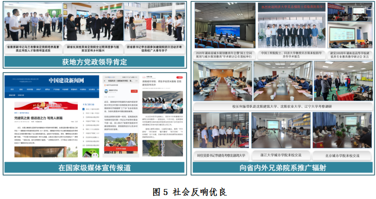 1.办学经验获得同行专家肯定。全国城乡规划专业教指委主任、中国工程院院士、同济大学吴志强教授认为我校城乡规划专业是湖南地区学科发展的起源地;中国城市规划学会副理事长兼秘书长石楠教授等评估委专家高度肯定我校面向中小城镇的专业办学,认为“历史悠久、地方影响力大;定位准确,人才适应性强;特色突出,专业教学体系完整;笃行上进,学生综合素质好”。