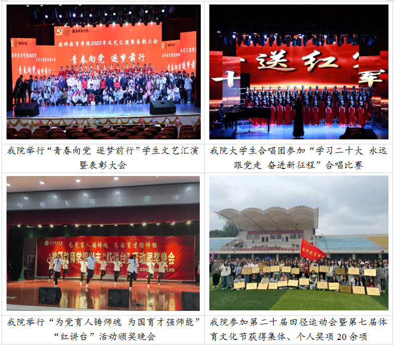 打造“周末红讲台”学生社团活动精品,围绕师范技能培养组建了演讲、书法、绘画、音乐、舞蹈、体育等学生社团,通过讲红色故事、练书法作品、演情景剧、绘制红色主题黑板报、党史教育手抄报、唱红歌等“美育浸润”社团活动,促进师范生德智体美劳全面发展。学院《中华优秀传统文化“三融三进”美育育人新格局的构建与实践》案例获得全国第七届大学生艺术展演活动高校美育改革创新优秀案例二等奖。