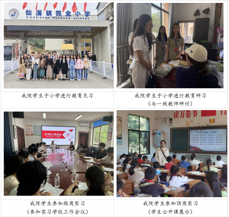 我院突出实践育人导向,设计体系化的实践教学,确保实践贯穿培养全过程,开设“见习-研习-跟岗-顶岗”全链条实践课程,实现理论课教学与实践体验交叉往复、有机结合、相互促进。通过“教育见习与小学现场(大一)”“教育研习与课程学习(大二)”“跟岗实习与一线课堂(大三)”“顶岗实习与职场体验(大四)”四个贯通一体化设计,将教育实践贯穿于师范生人才培养全过程,促进了教育实践与其他培养环节的有机衔接,满足了多样化、差异化的教育功能需求,显著提高了我院师范生教育实践成效及目标达成度。