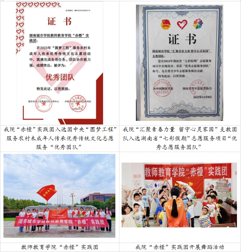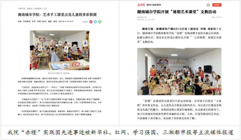 学院积极组织学生深入社区、乡村基层开展支教志愿服务和社会实践活动,组建“赤橙”实践团,将教育家精神“胸怀天下、以文化人的弘道追求”浸润式融入学生成长成才过程,引导学生树立终身从教的坚定信念。“赤橙”实践团长期深入城乡基层开展义务支教活动,受益青少年儿童达1000余人次,累计志愿服务时长5000余小时。该团队入选团中央“圆梦工程”服务农村未成年人传承优秀传统文化志愿服务团队,荣获湖南省“三下乡”优秀团队、优秀品牌项目、湖南省“七彩假期”优秀志愿服务团队,先进事迹多次被新华社、红网、学习强国、三湘都市报等主流媒体报道,社会反响热烈。