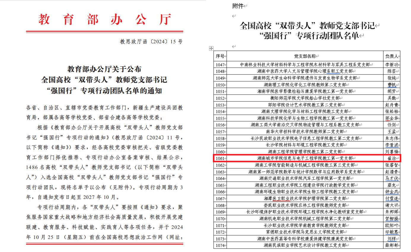 本网讯(通讯员 钟瑜)近日,教育部办公厅《关于公布全国高校“双带头人”教师党支部书记“强国行”专项行动团队名单的通知》结果公示,信息与电子工程学院教工第一党支部入选全国高校“双带头人”教师党支部书记“强国行”专项行动团队。