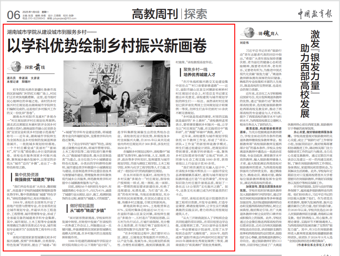 本网讯 1月6日,《中国教育报》06版高教周刊头条,报道我校从城市建设到服务乡村,以学科优势绘制乡村振兴新画卷。全文如下: