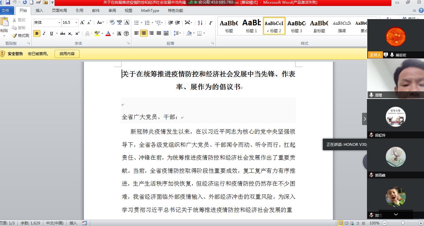 首先由支部书记周理同志领学了《学习“关于在统筹推进疫情防控和经济社会发展中当先锋、作表率、展作为的倡议书”》的文件精神,学习了中共湖南省委组织部关于在落实常态化疫情防控举措和全面推进复工复产的六条建议;然后由组织委员段虹伶同志带领大家一起学习了《深入学习习近平总书记关于统筹推进疫情防控和经济社会发展的重要讲话精神》的部分内容;宣传委员熊志宏同志带领大家一起学习了《荣耀体育官方网页版_荣耀体育(中国)党员教育管理办法》。学习完三个文件精神后,支部的党员同志开展了热烈的网上讨论。